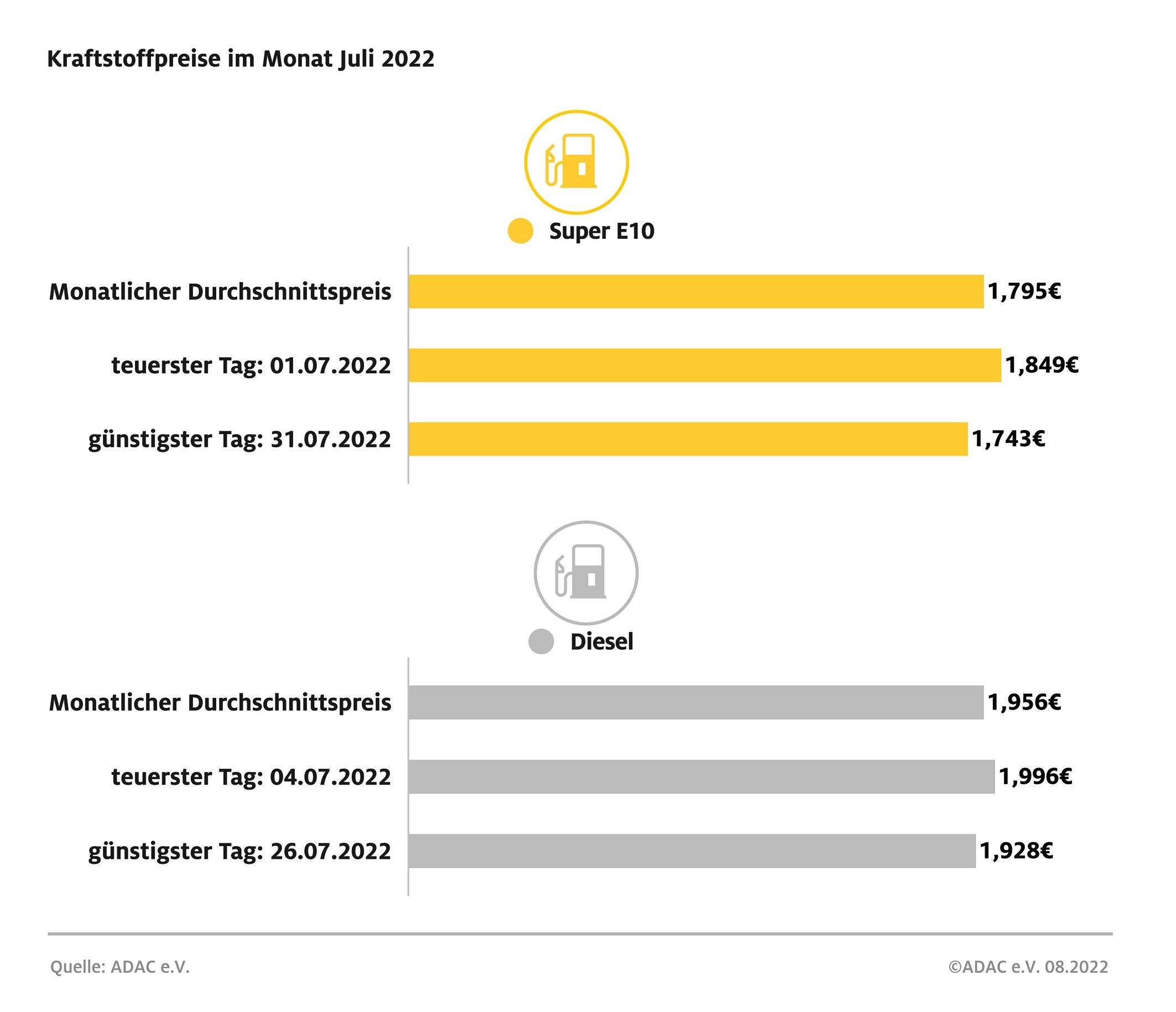 Am teuersten war Tanken in den ersten Julitagen, am günstigsten gegen Ende des Monats. Für Super E10 musste man am 1. Juli mit 1,849 Euro am meisten bezahlen, am wenigsten am 31. Juli mit 1,743 Euro. Damit ist Benzin binnen eines Monats um 10,6 Cent günstiger geworden. Teuerster Diesel-Tag war der 4. Juli mit einem Tagesdurchschnittspreis von 1,996 Euro. Am preiswertesten tankten Dieselfahrer am 26. Juli mit durchschnittlich 1,928 Euro. Die Differenz zwischen teuerstem und günstigstem Tank-Tag im Juli beträgt somit bei Diesel-Kraftstoff 6,8 Cent.
