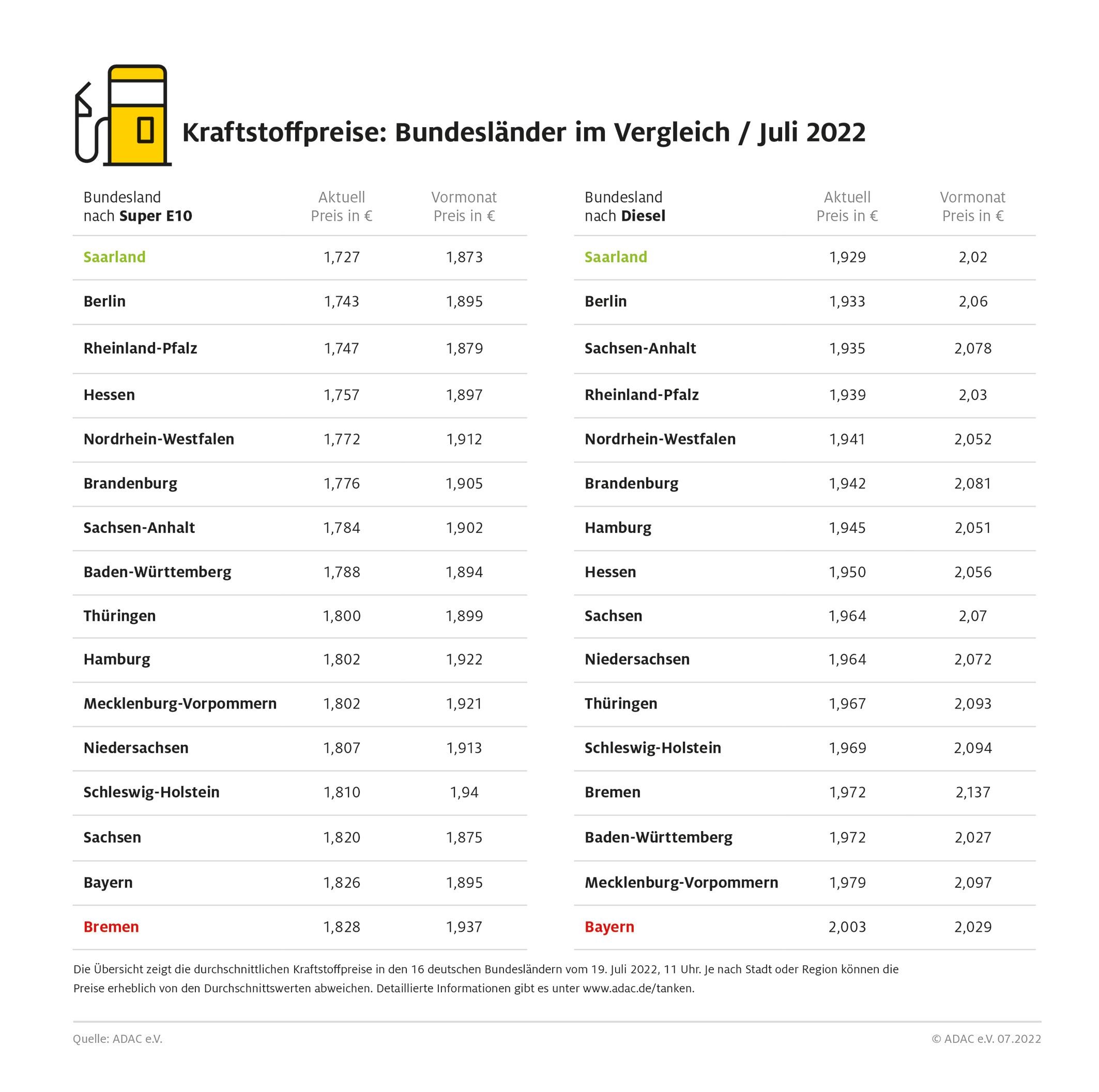 München (ots) – Zwischen den deutschen Bundesländern gibt es derzeit große Unterschiede bei den Kraftstoffpreisen. Während sich die Autofahrerinnen und Autofahrer im Saarland über vergleichsweise niedrige Preise für Benzin und Diesel freuen können, muss man in Bremen und Bayern beim Bezahlen deutlich tiefer in die Tasche greifen. Wie die aktuelle ADAC Auswertung der Kraftstoffpreise in den 16 Bundesländern zeigt, kostet ein Liter Super E10 in Bremen mit 1,828 Euro am meisten, dicht gefolgt von Bayern mit einem Durchschnittspreis von 1,826 Euro. Am preiswertesten ist Benzin im Saarland: Hier muss man für einen Liter Super E10 1,727 Euro bezahlen, das sind 10,1 Cent weniger als in Bremen.
