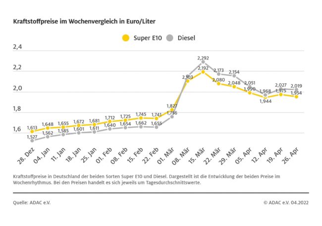München (ots) – Nach dem dramatischen Anstieg der Kraftstoffpreise im März hat sich die Situation an den Tankstellen im April etwas entspannt. Von einer Entwarnung kann jedoch noch lange nicht gesprochen werden. Wie die aktuelle ADAC Auswertung der Kraftstoffpreise in Deutschland zeigt, kostete ein Liter Super E10 im April 2022 im Mittel 1,970 Euro – das…