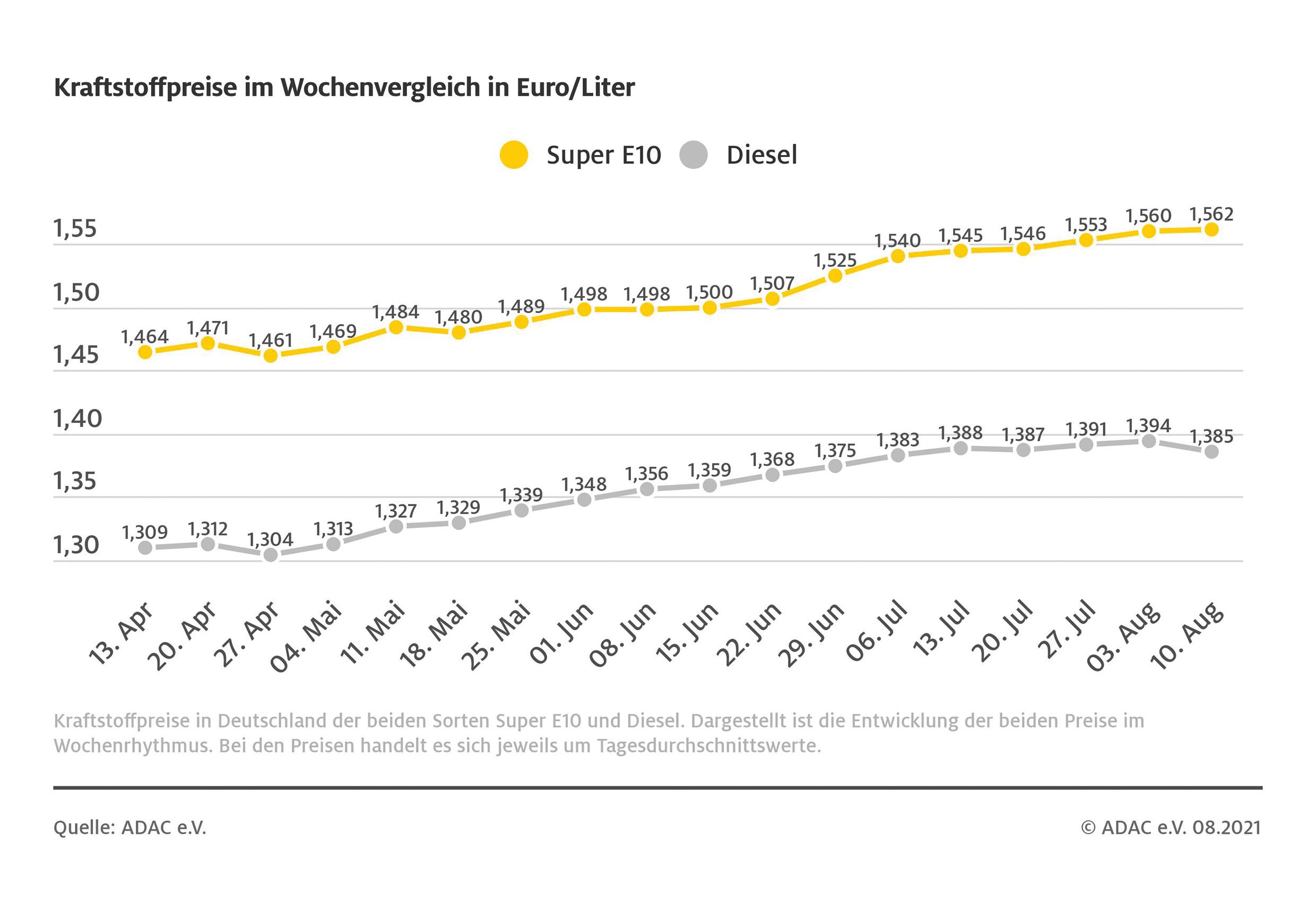 Der Preis für Diesel-Kraftstoff ist hingegen erstmals seit längerem wieder gesunken. Laut ADAC kostet ein Liter im Schnitt 1,385 Euro und damit 0,9 Cent weniger als in der Vorwoche.