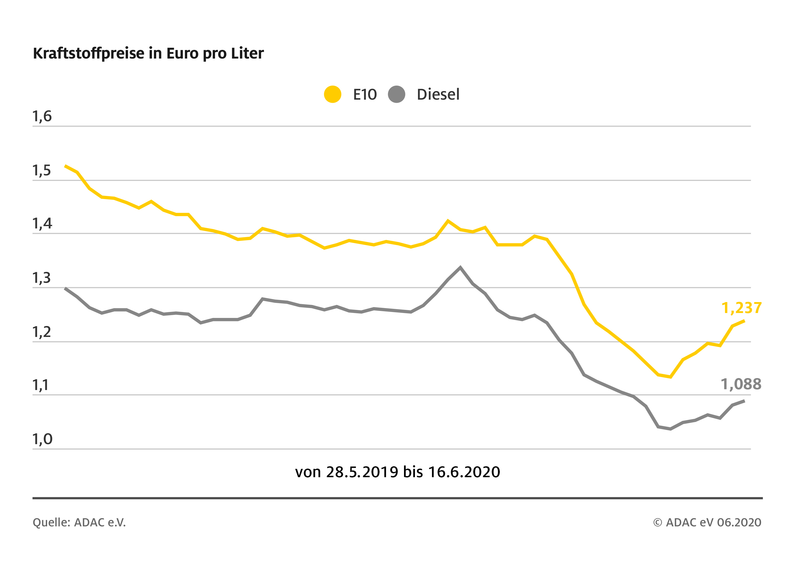 Der Preisanstieg seit den Tiefstwerten Ende April – bei Super E10 durchschnittlich rund zehn Cent, bei Diesel etwa fünf Cent – erklärt sich vor allem aus einer Verdoppelung der Rohöl-Preise von rund 20 Dollar je Barrel auf aktuell gut 40 US-Dollar.