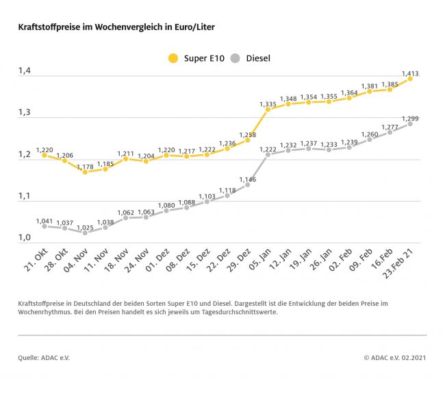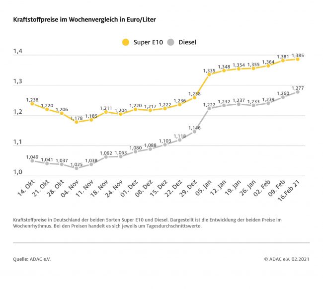 München (ots) Der Preisanstieg bei Benzin und Diesel setzt sich fort – dies zeigt die wöchentliche ADAC Auswertung der Kraftstoffpreise. Für einen Liter Super E10 müssen die Autofahrer demnach 1,385 Euro bezahlen, das sind 0,4 Cent mehr als in der Vorwoche. Benzin hat sich damit zum zehnten Mal in Folge im Rahmen der wöchentlichen Preisanalyse verteuert.…