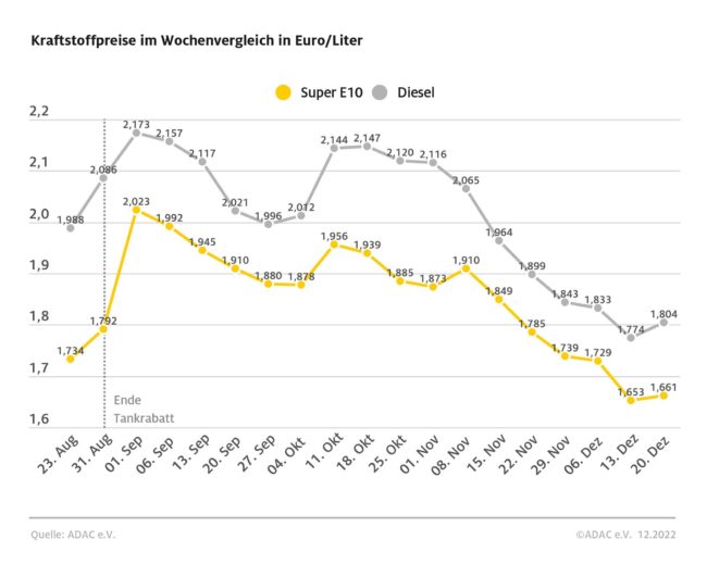München (ots) – Eine gute Nachricht für die Autofahrer: Tanken hat sich im Vergleich zur Vorwoche weiter deutlich verbilligt – dies zeigt die aktuelle ADAC Auswertung der Kraftstoffpreise in Deutschland. Danach kostet ein Liter Super E10 im bundesweiten Schnitt 1,653 Euro, das ist ein Minus von 7,6 Cent. Ebenfalls spürbar günstiger ist Diesel-Kraftstoff: Für einen Liter…
