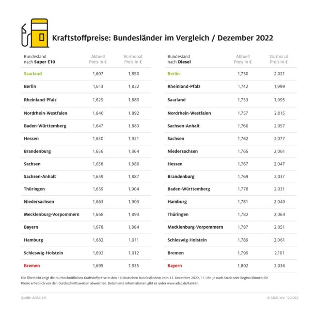ADAC: Bremen und Bayern mit den höchsten Spritpreisen – Tanken in Berlin und im Saarland am preiswertesten regionale Preisunterschiede wieder etwas geringer