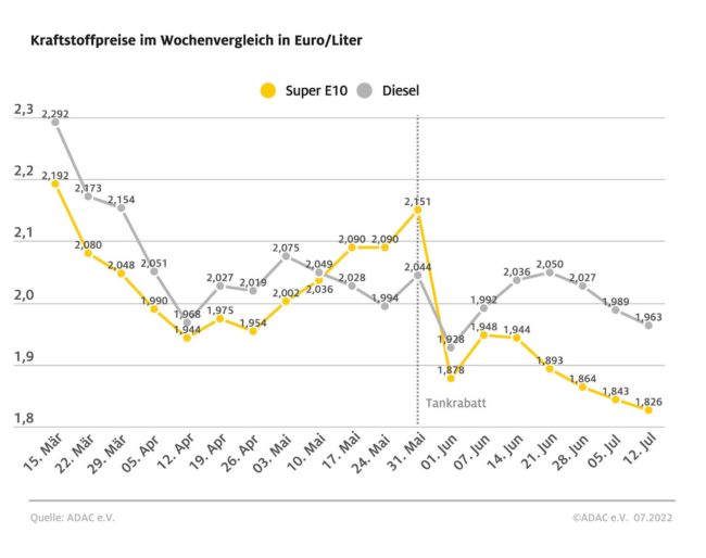 München (ots) – Die Kraftstoffpreise an den deutschen Tankstellen sind im Vergleich zur Vorwoche erneut etwas gesunken. Wie die heutige ADAC Auswertung der Kraftstoffpreise ergibt, müssen die Autofahrer für einen Liter Super E10 derzeit im bundesweiten Mittel 1,826 Euro bezahlen, das ist ein Rückgang von 1,7 Cent. Auch der Dieselpreis hat binnen Wochenfrist nachgegeben: Ein…