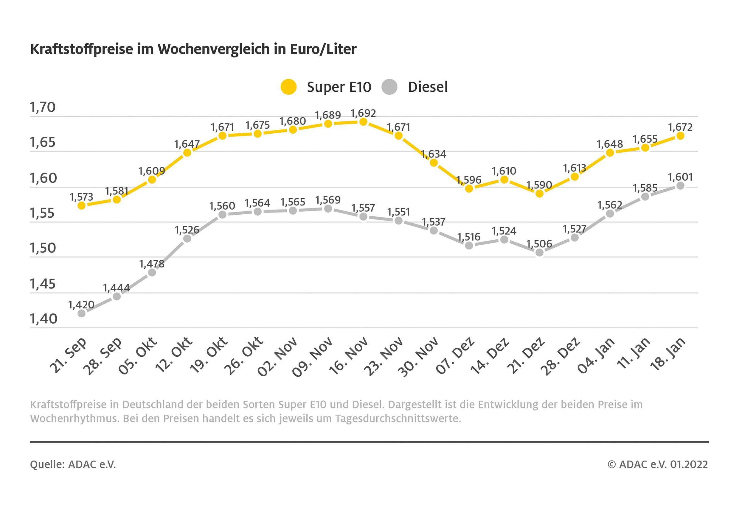 Benzin ist um 1,7 Cent teurer als in der vergangenen Woche. Für einen Liter Super E10 müssen die Autofahrer aktuell im Mittel 1,672 Euro bezahlen. Vom Allzeithoch (1,709 Euro am 13. September 2012) ist E10 aber noch 3,7 Cent entfernt.