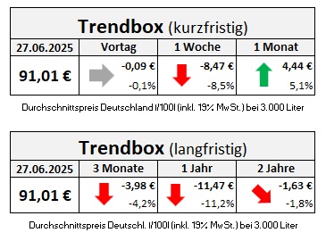 Die Waffenruhe hatte zur Folge, dass sich Rohöl und die Heizöl im weiteren Wochenverlauf nahezu auf einem Preisniveau stabilisieren konnten, wie es vor dem Ausbruch des sogenannten „12-Tage-Krieges“ vorgeherrscht hatte. Am Freitag mussten durchschnittlich nur noch 91,01 Euro für 100 Liter gezahlt werden, nach 99,48 Euro am Freitag zuvor.