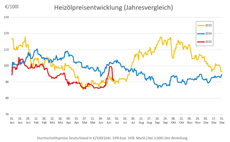 Angesichts dieser Entwicklung haben sich die durchschnittlichen Heizölpreise innerhalb von nur einer Woche wieder deutlich ihren am 5. Mai bei 85,72 Euro festgestellten bisherigen Jahrestiefpreis angenähert. Nach Beginn des israelischen Angriffs am 13. Juni hatte sich Heizöl im Bundegebiet bis auf 99,49 Euro verteuert.