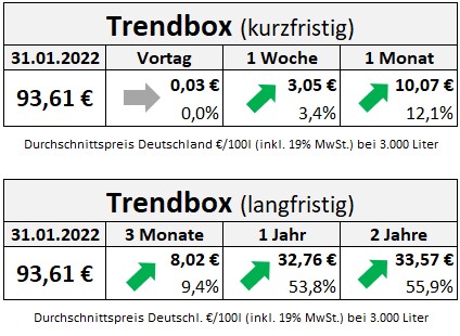 Der erste Monat des Jahres ist vorbei und endet mit dem höchsten Preisniveau seit Jahren. Zwar ist der durchschnittliche Heizölpreis von Freitag auf Montag nahezu gleich geblieben, doch seit Monatsbeginn hat er um über 12 Prozent zugelegt. Der große Preistreiber bleibt der Rohölpreis an den Ölbörsen. Hier kennen die Kurse seit Monaten nur noch eine Richtung – aufwärts!