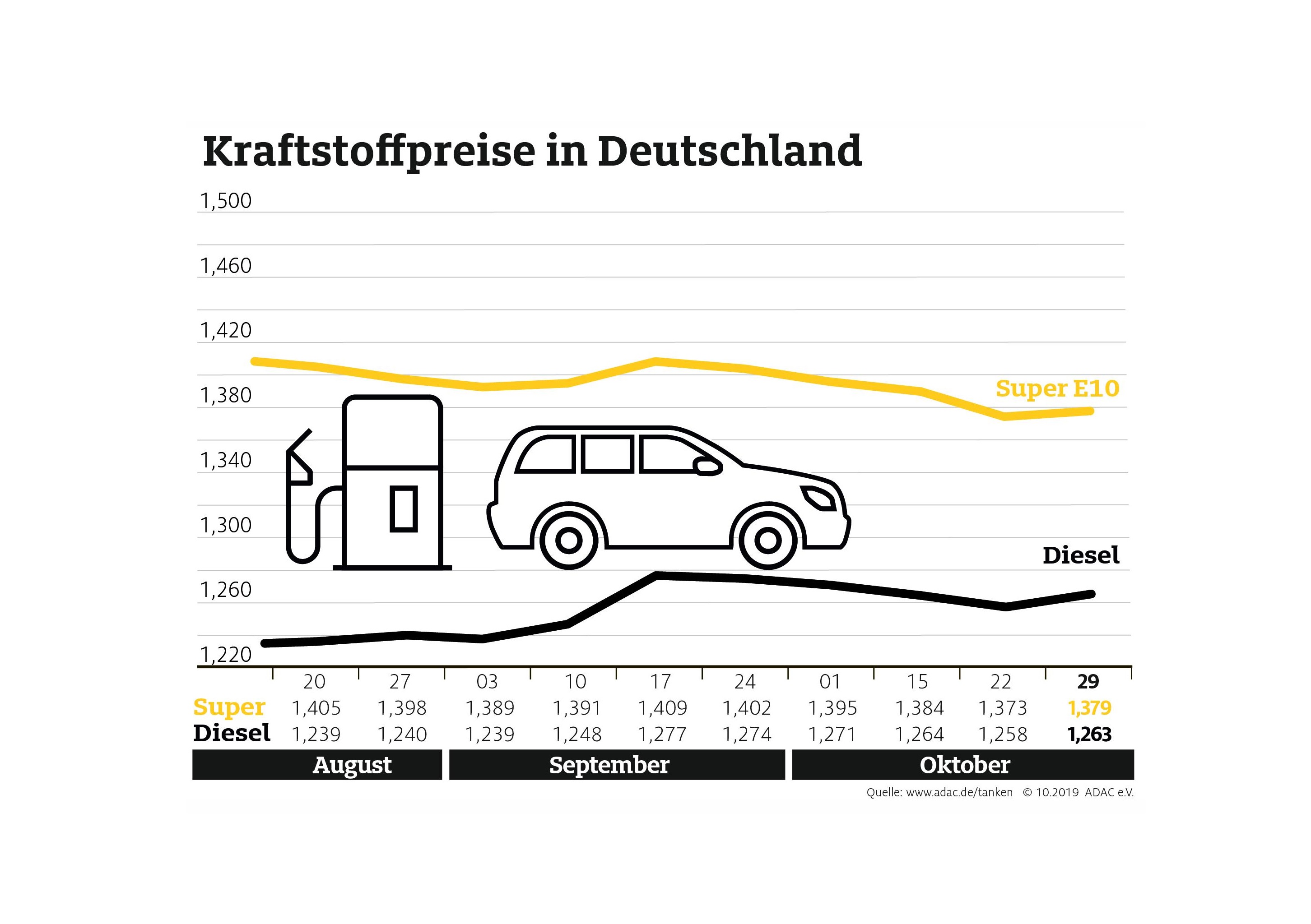 Nachdem die Durchschnittspreise für Benzin und Diesel zuletzt fünf Wochen in Folge gesunken sind, wird Tanken in Deutschland wieder teurer. Laut aktueller Auswertung des ADAC kostet ein Liter Super E10 im Bundesmittel derzeit 1,379 Euro, das sind 0,6 Cent mehr als in der Vorwoche. Diesel verteuerte sich um 0,5 Cent auf durchschnittlich 1,263 Euro je Liter.