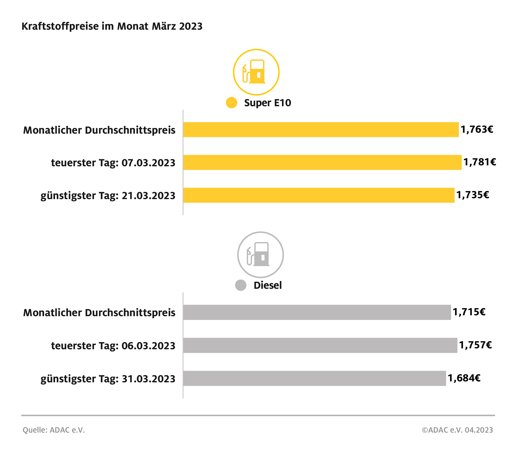 Teuerster Tanktag des Monats war bei Benzin der 7. März. Damals lag der Tagesdurchschnittspreis für einen Liter Super E10 bei 1,781 Euro. Am günstigsten war Super E10 am 21. März mit 1,735Euro. Dieselfahrer mussten am 6. März am meisten bezahlen: Ein Liter Diesel kostete 1,757 Euro. Am billigsten war Diesel am 31. März mit 1,684 Euro. Nach Ansicht des ADAC ist bei beiden Kraftstoffsorten noch Spielraum für Preissenkungen. In die richtige Richtung hat sich jedoch die Preisdifferenz zwischen den beiden Sorten entwickelt: Während Super E10 am Monatsbeginn lediglich gut drei Cent günstiger war als Diesel, vergrößerte sich diese Spanne zum Monatsende auf knapp zehn Cent.